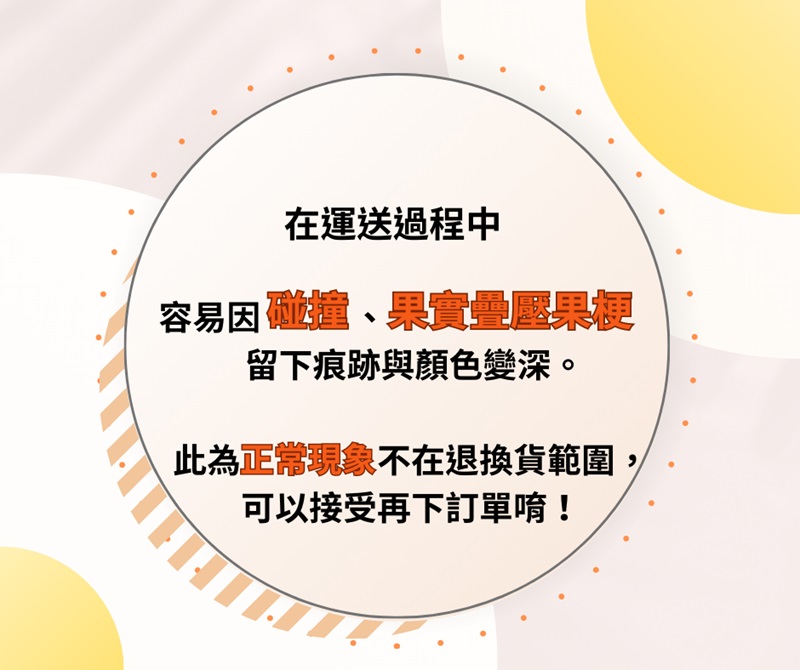 若是因水果保存不良導致變質,恕無法辦理退換貨,敬請見諒。